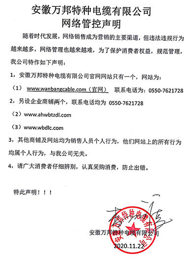 鄭重聲明:安徽萬邦特種電纜有限公司官方網站為:www_wanbangcable_com.a1608.cn,除此之外無任何子網站或合作網站,其余均為假冒偽劣。電話:0550-7621728 13485756353 地 址:安徽省天長市滁州高新技術產業開發區經四路29號